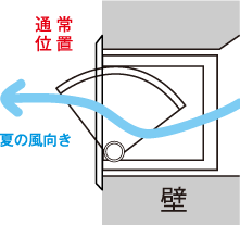 夏はルーバーを通常位置で使用し、風が天井伝いに流れるようにします。頭上からの風が部屋全体を涼しくします。